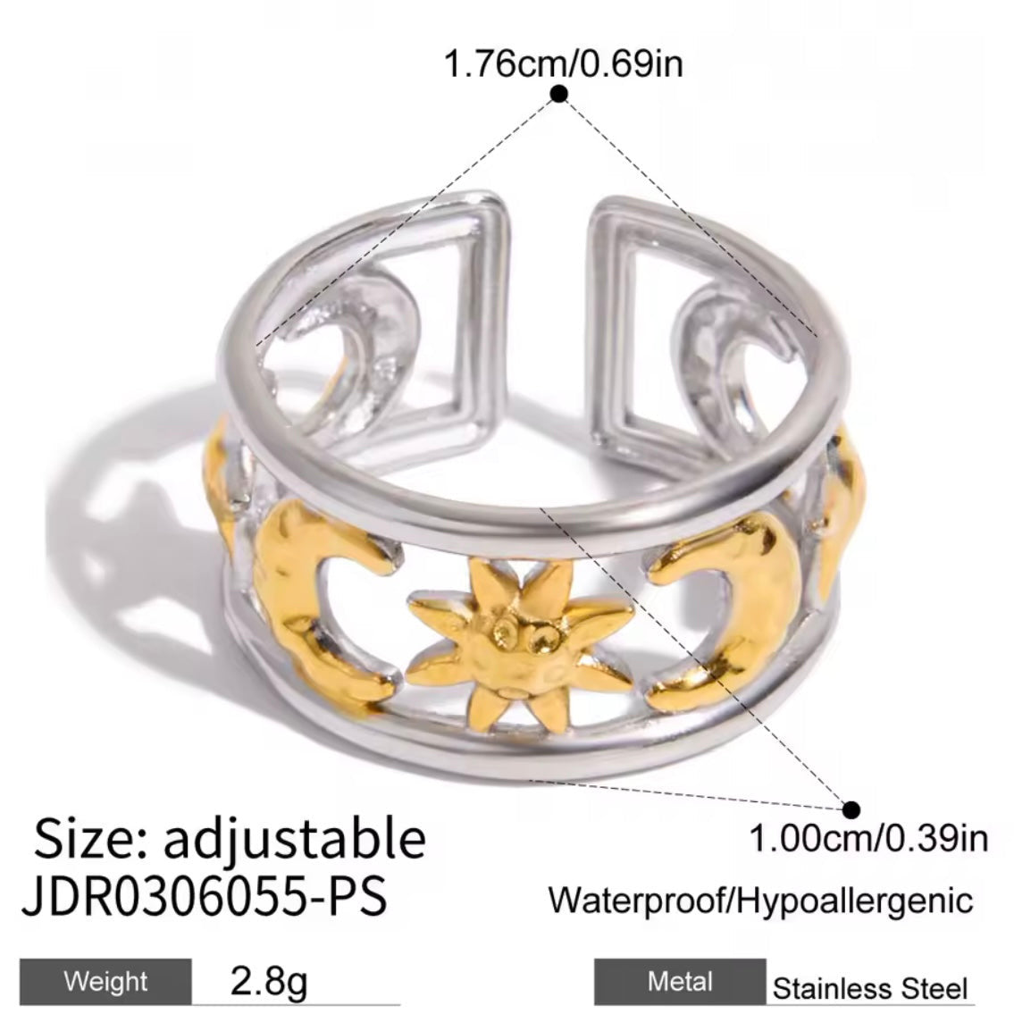 ¡Adorna tu dedo con el Anillo Astralis bicolor! Con diseño adaptable y fabricado en acero inoxidable, podrás lucir las hermosas lunas, soles y estrellas presentes en su detalle. ¡Un accesorio que te hará brillar con estilo y personalidad! ¡Hazlo tuyo ahora!