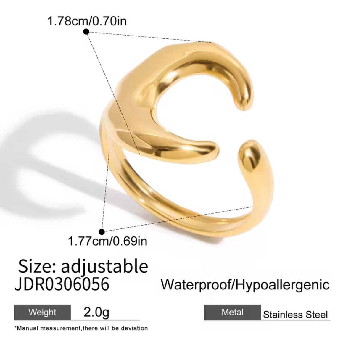 "¡Siente la energia de la Luna con nuestro anillo de acero inoxidable dorado y ajustable! Con su diseño de Luna, lucirás radiante y segura de ti misma. Un accesorio único que te hará brillar en cualquier ocasión."