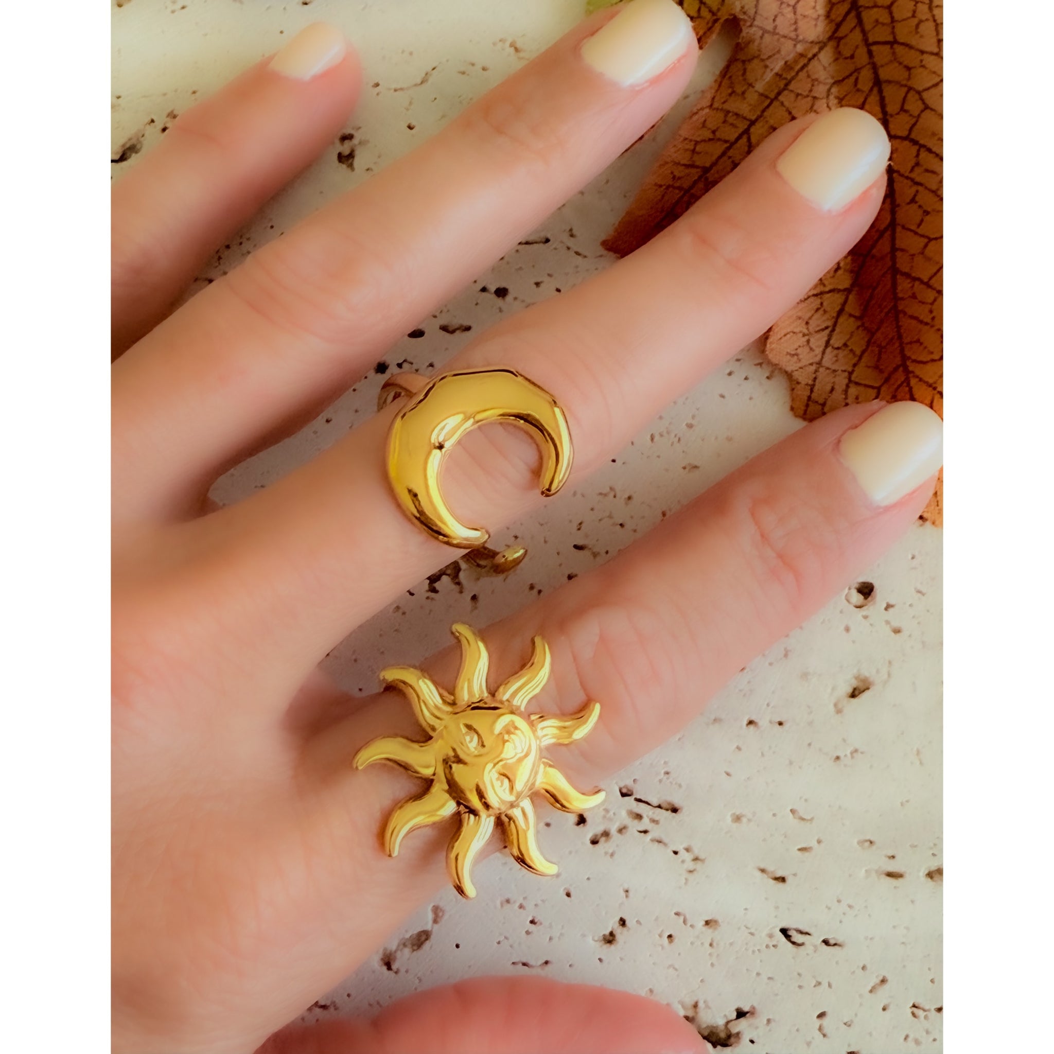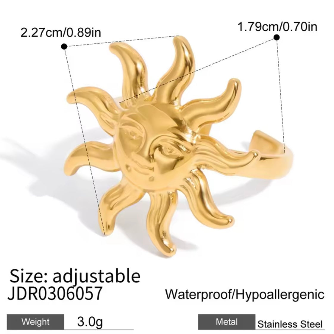 "¡Siente el poder del rey sol con nuestro anillo de acero inoxidable dorado y ajustable! Con su diseño de Sol, lucirás radiante y segura de ti misma. Un accesorio único que te hará brillar en cualquier ocasión."