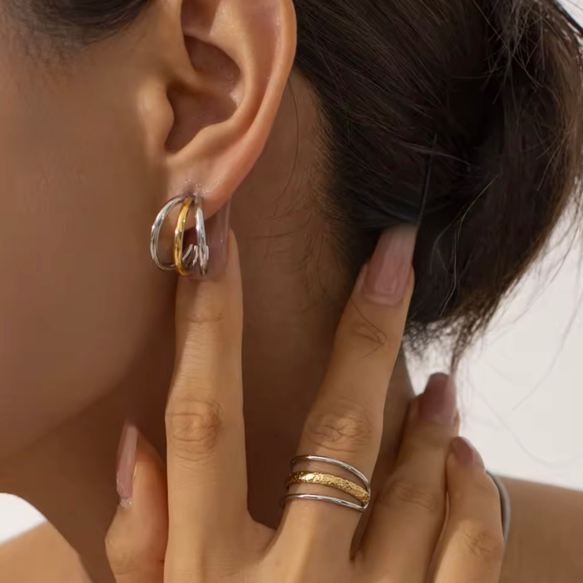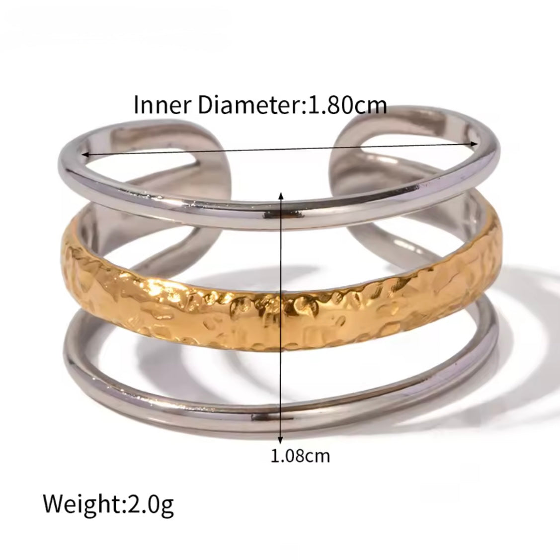 El anillo triple bicolor te brinda un estilo moderno y elegante. Hecho de acero inoxidable de alta calidad en color plata con un toque dorado con textura que le dará un toque de moda a tus manos. Este anillo es versátil y de alta calidad.