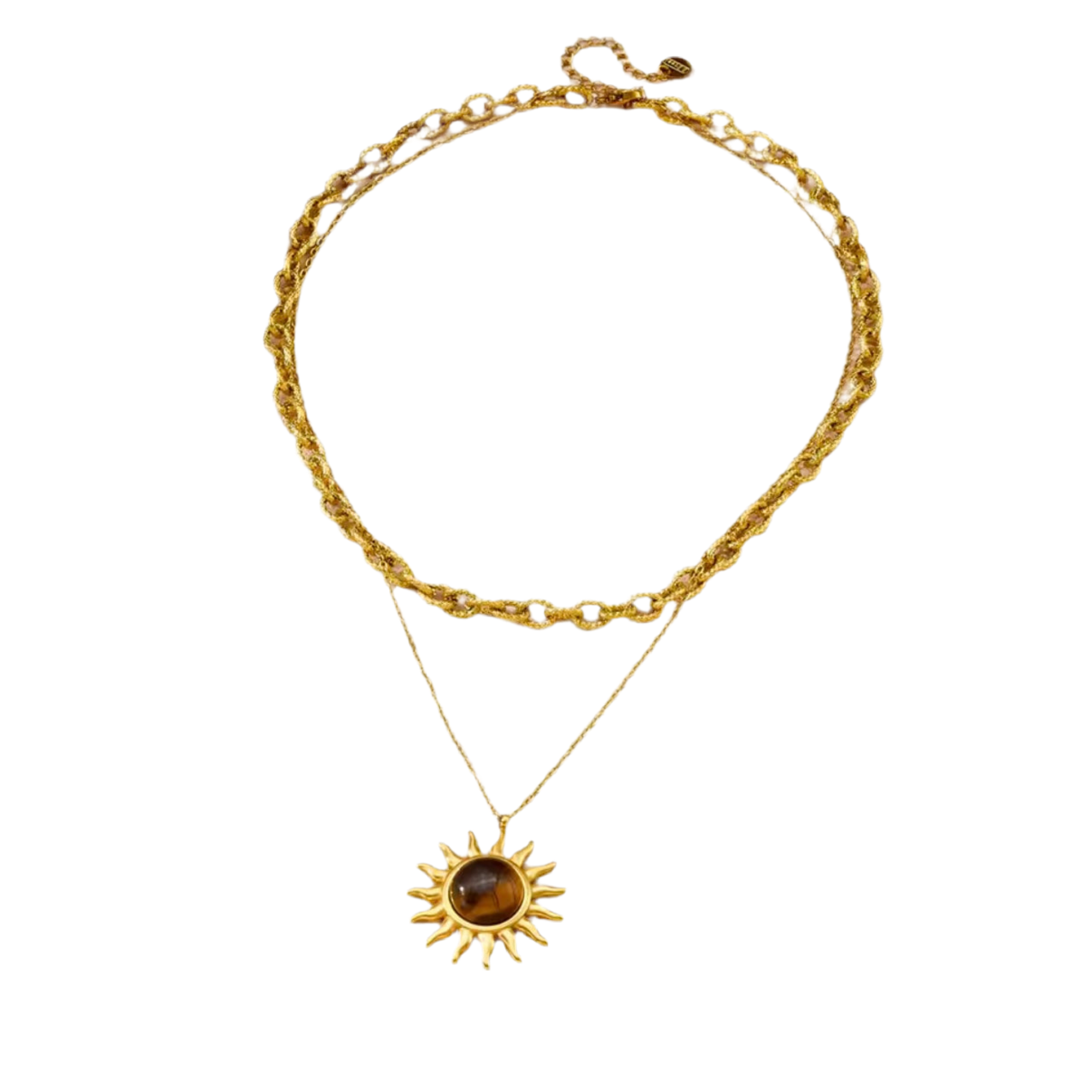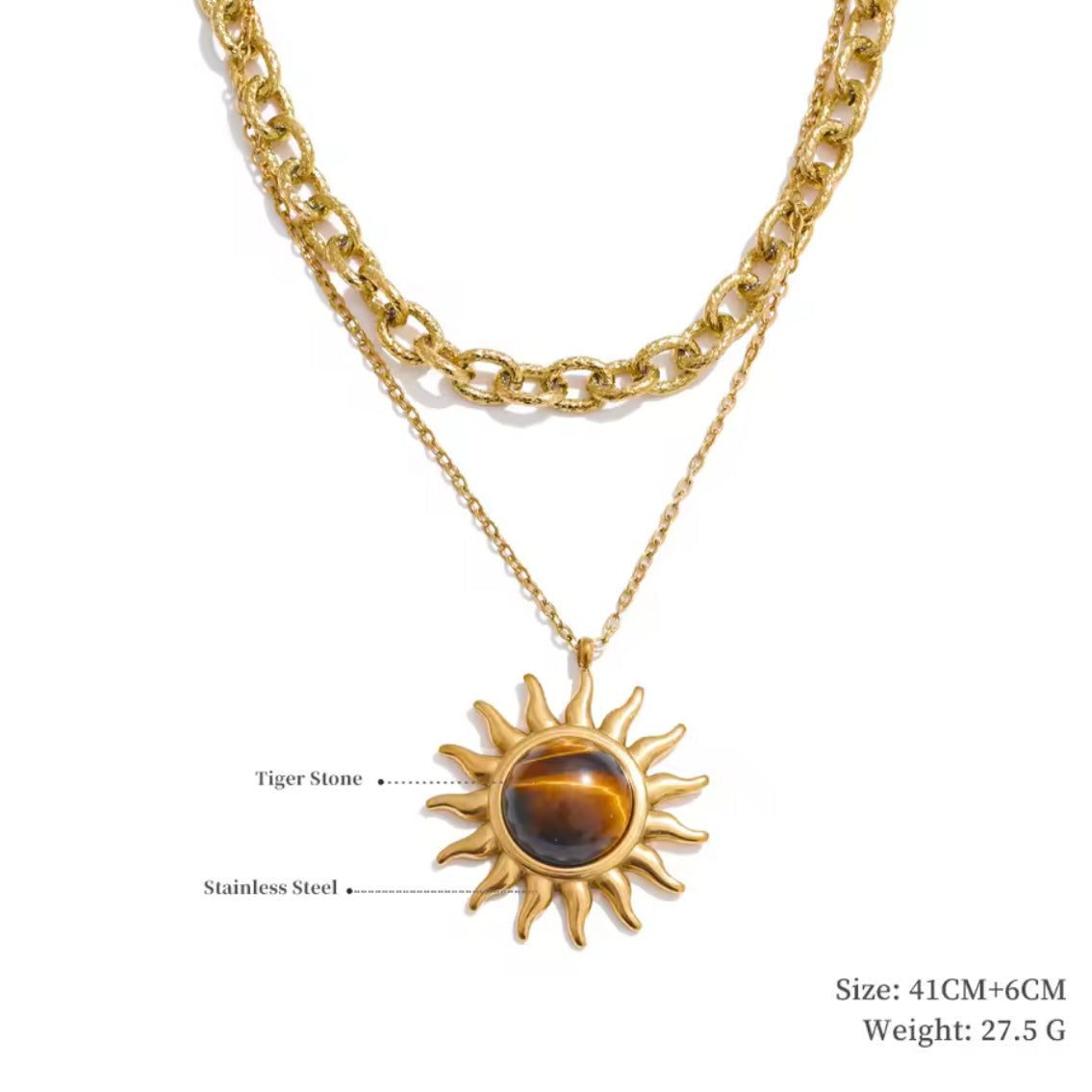 ¡Protege y atrae con estilo con nuestro collar doble con ojo de tigre! Hecho de acero inoxidable duradero, este collar cuenta con un colgante doble sol y ojo de tigre para brindar protección y atraer la buena energía. ¡Añade un toque de estilo y beneficios a tu outfit con este collar único!