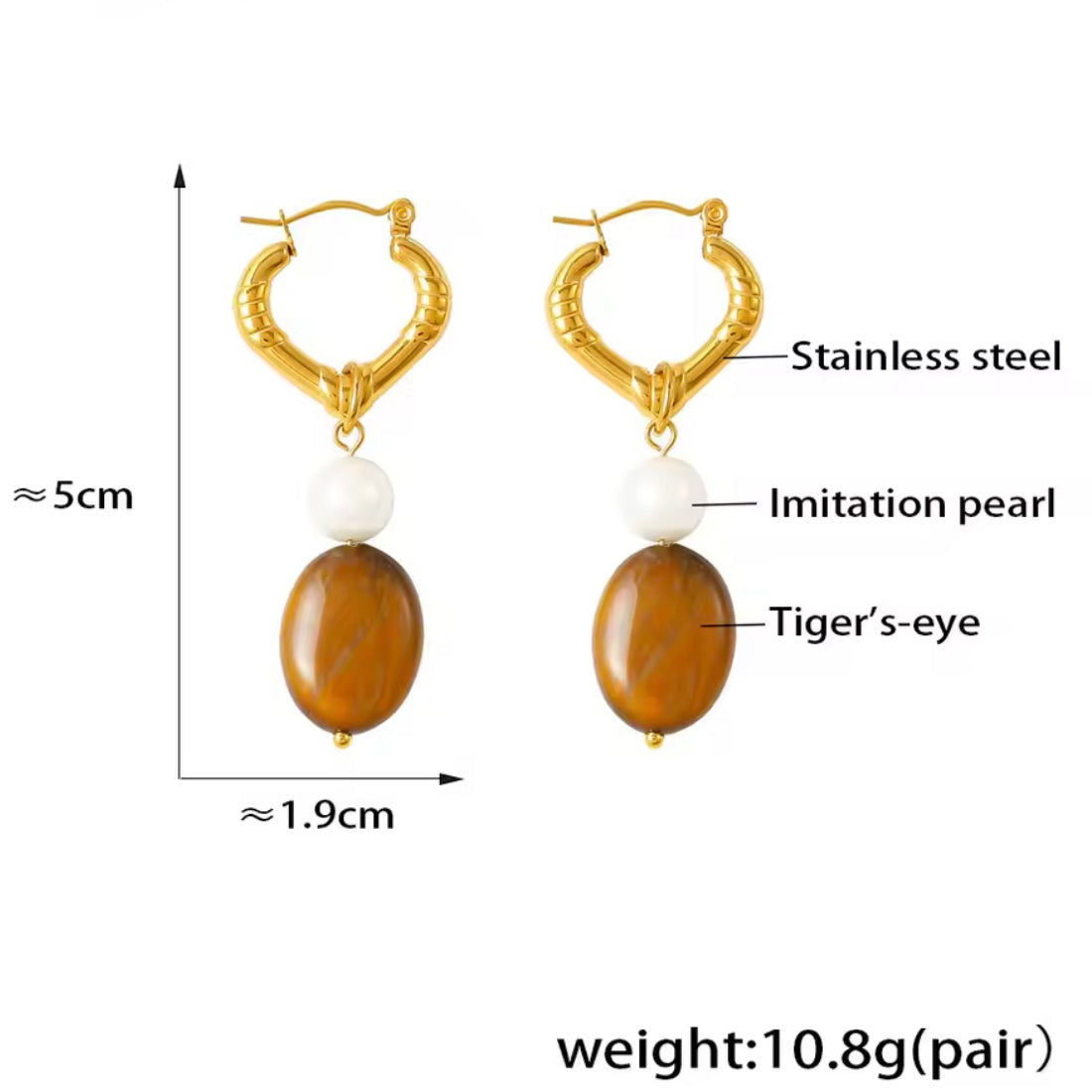 ¡Realza tu estilo con los pendientes de ojo de tigre y perla imitación de acero inoxidable! El ojo de tigre te dará protección y fuerza, mientras que la perla imitación añade un toque de elegancia. ¡Completa tu look con estos pendientes únicos!