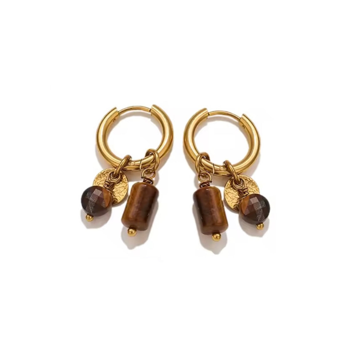 Descubre la elegancia y la belleza de los Pendientes Charms con piedras naturales de ojo de tigre. Estos pendientes de aro de acero inoxidable dorado, son la combinación perfecta de estilo y calidad. ¡Añádelos a tu colección de joyas y siéntete radiante!
