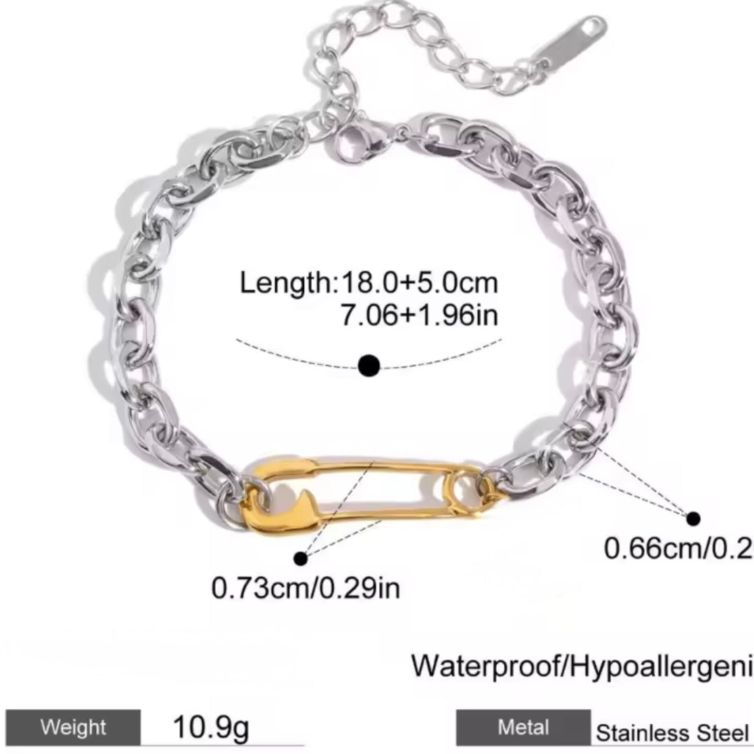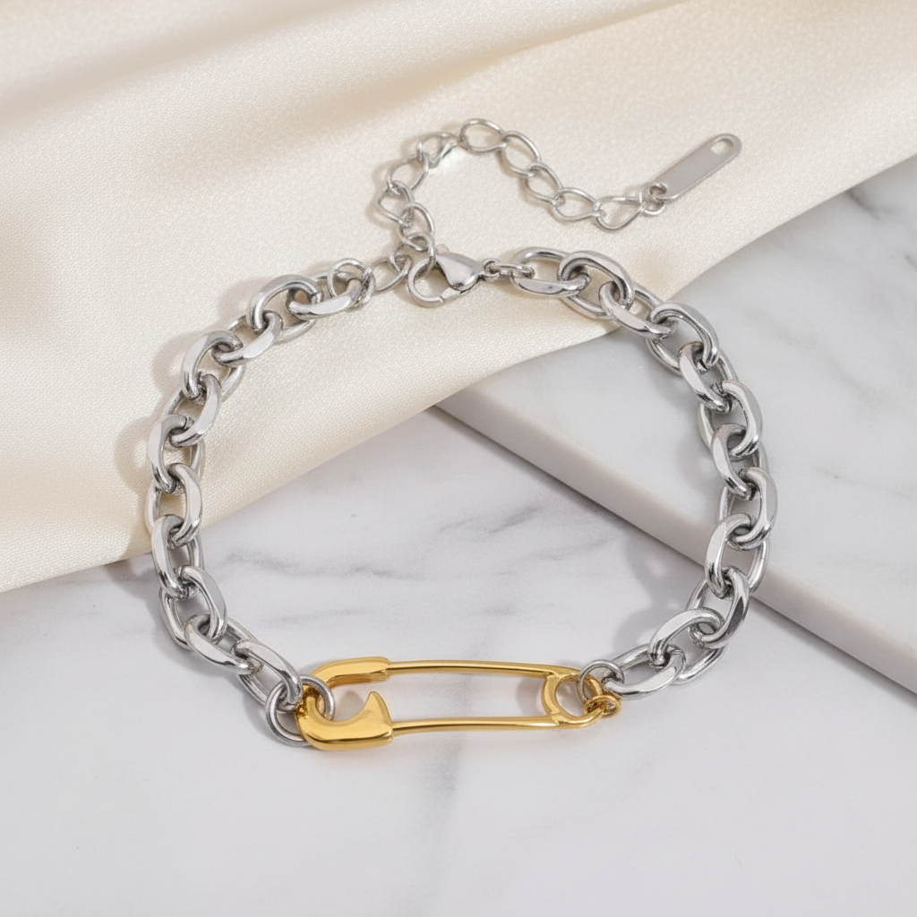 ¡Añade un toque de moda a tu estilo con nuestra pulsera gruesa bicolor! Hecha de acero inoxidable, cuenta con eslabones plateados y un gancho con acabado en oro. Ajustable para mayor comodidad.