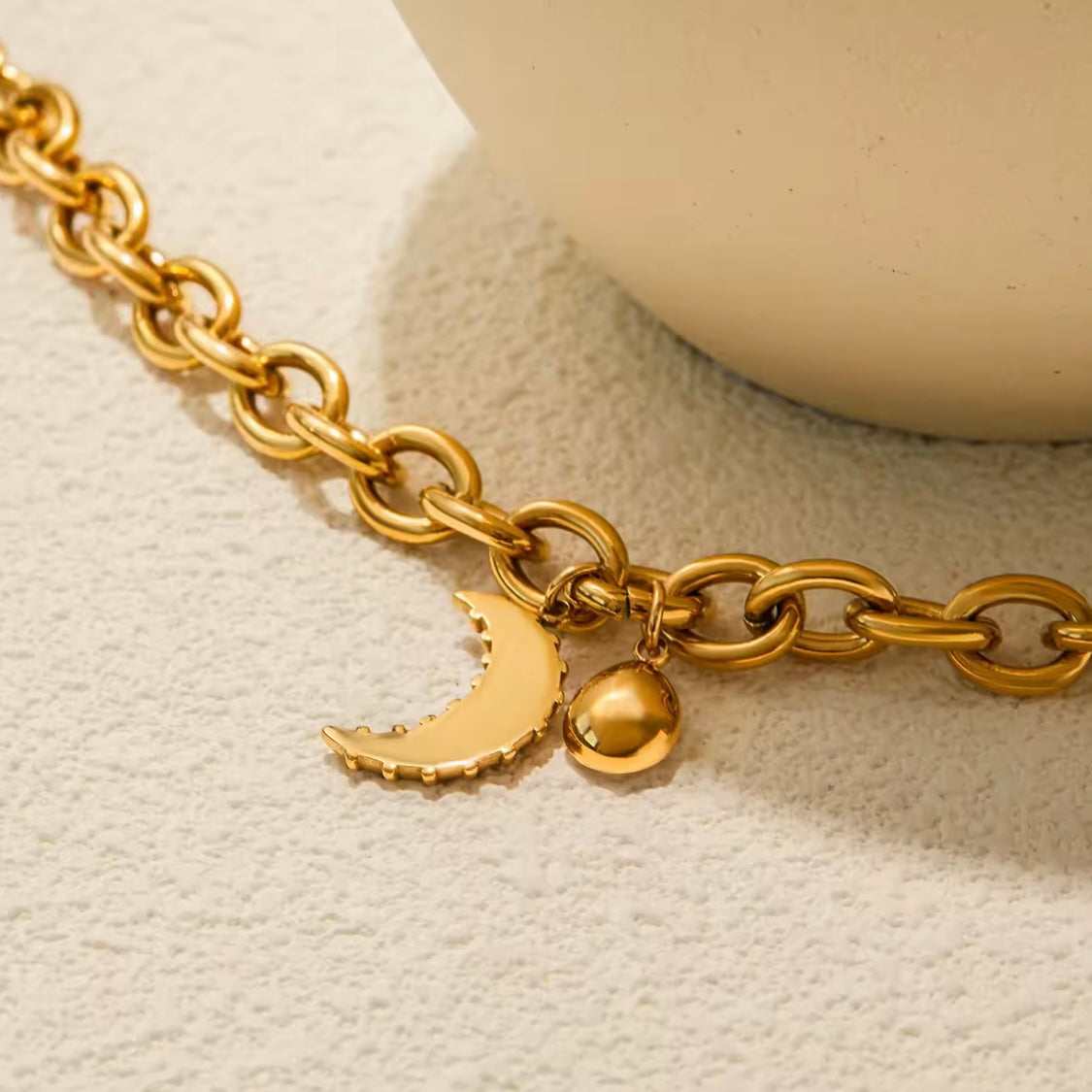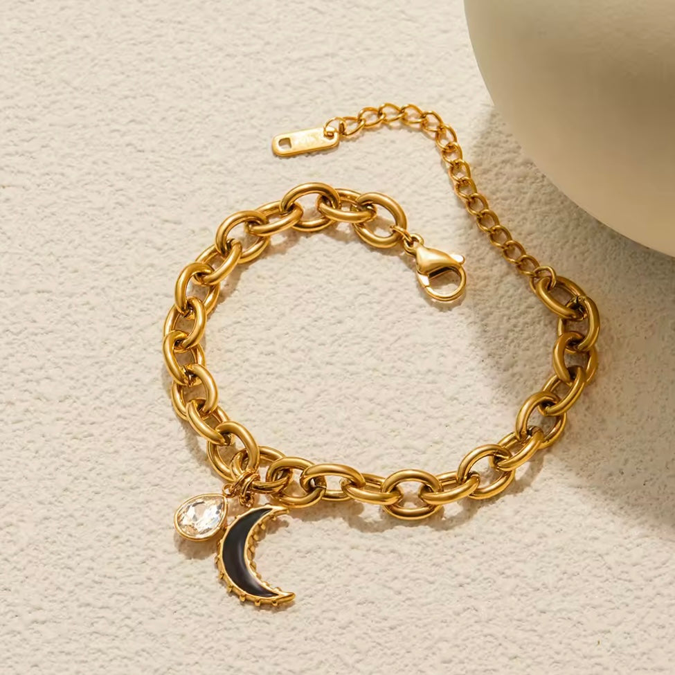 ¡Lleva la magia de la luna contigo con nuestra pulsera Luna Negra Oro! Hecha de acero inoxidable de alta calidad, esta pulsera presenta una luna negra en el centro. La cadena ajustable te permite adaptarla a tu muñeca para un ajuste perfecto. El dorado le da un toque elegante y místico. ¡Atrévete a brillar!